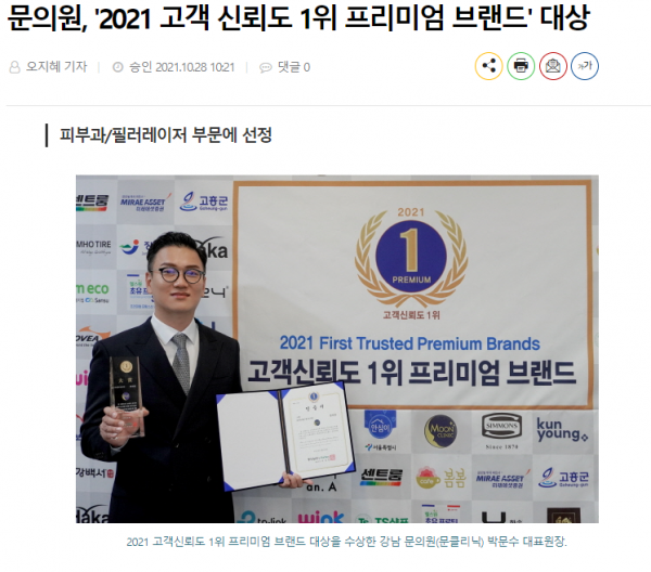 문의원(문클리닉)이 중앙일보, 포브스 코리아가 주최하는 ‘2021 고객 신뢰도 1위 프리미엄 브랜드 대상’ 피부과/필러레이저 부문에 선정됐다.